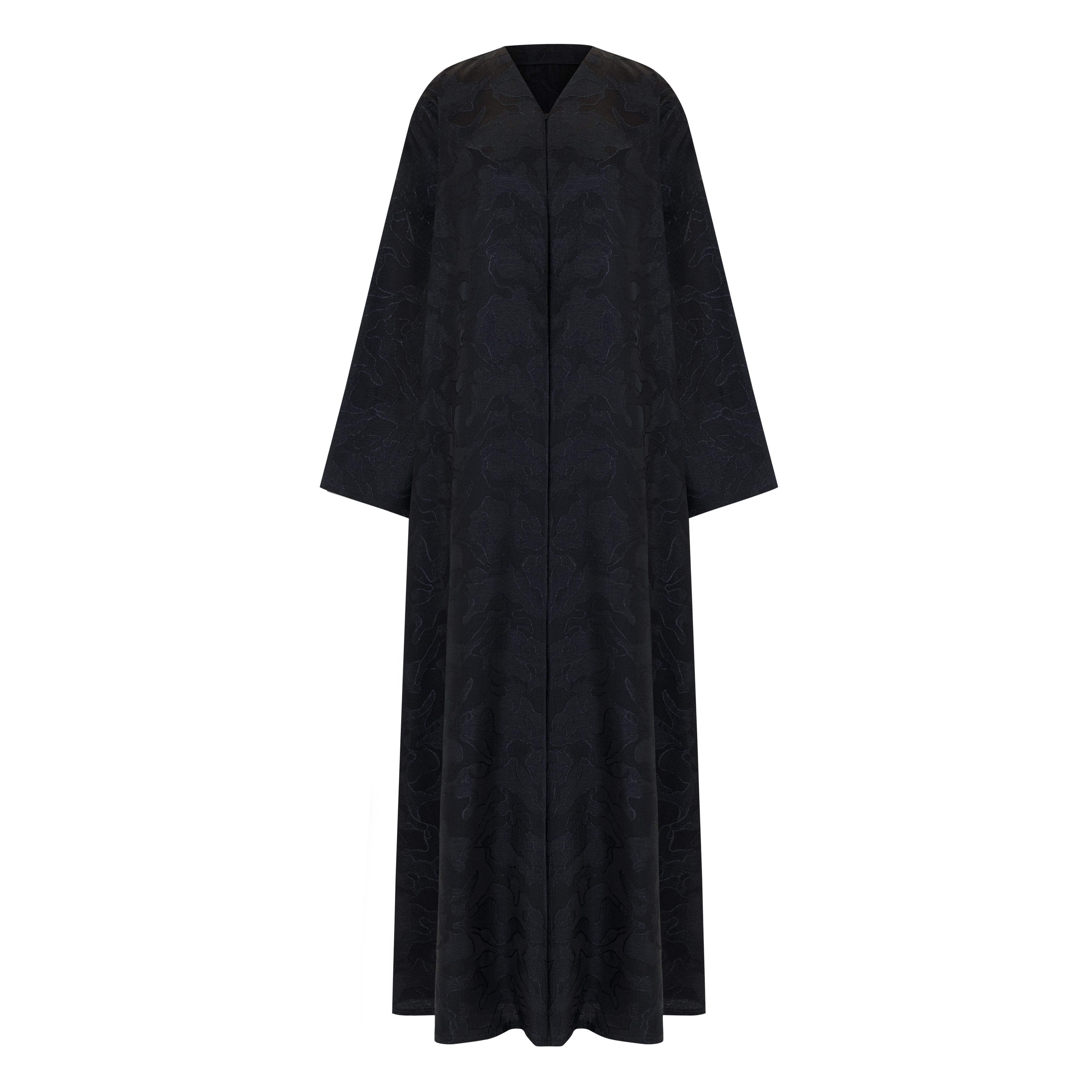The Eclipse Glow Abaya a masterpiece of luxury and sophistication. Crafted from premium woven jacquard fabric, this abaya features an intricate floral pattern subtly interwoven with shimmering silver thread, creating a mesmerizing play of light and texture.